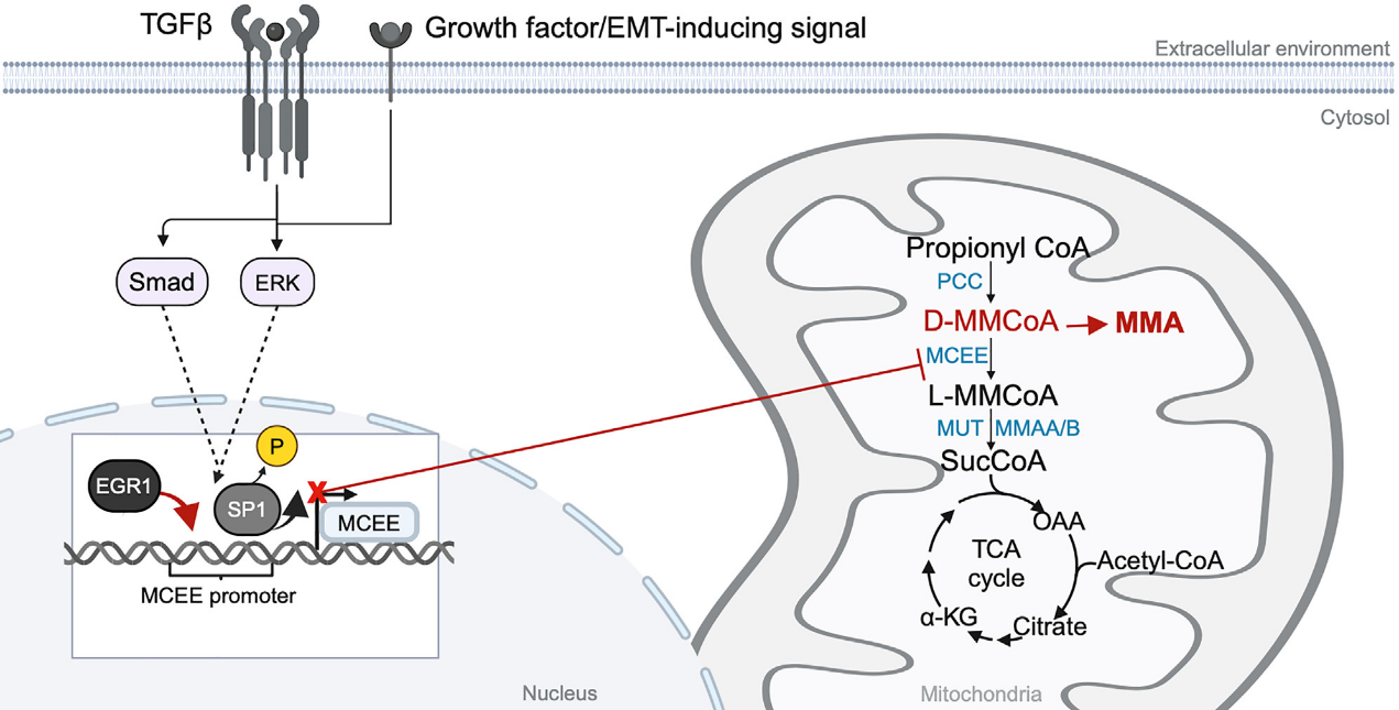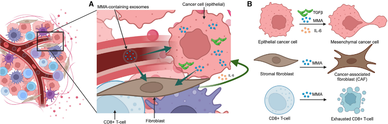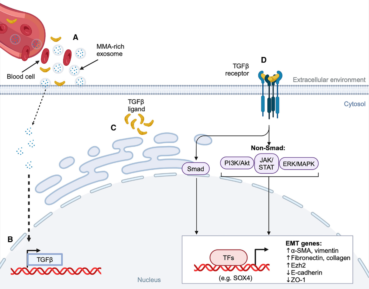 体外实验表明,MMA可通过激活TGF-β信号通路,诱导癌细胞发生EMT,显著增强其迁移和侵袭能力。在动物模型中,循环系统中高浓度的MMA能够促进肺癌和乳腺癌的远处转移,这一过程可能与细胞外囊泡(EVs)对MMA的包装和运输有关。