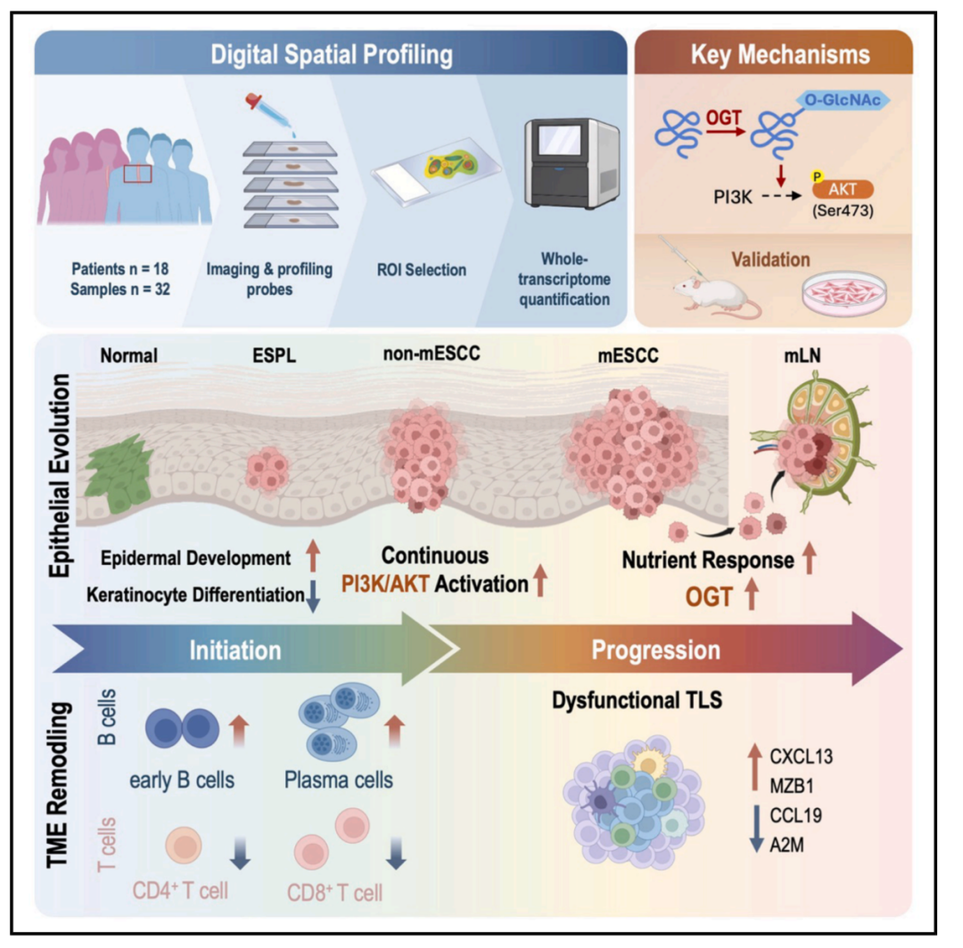 这一成果不仅揭示了肿瘤微环境(TME)在疾病发展进程中的动态重塑特性,还精准定位了一个在晚期特异性激活的关键驱动基因——OGT,为食管癌的早期预警和晚期精准治疗提供了全新的理论支撑与潜在靶点。