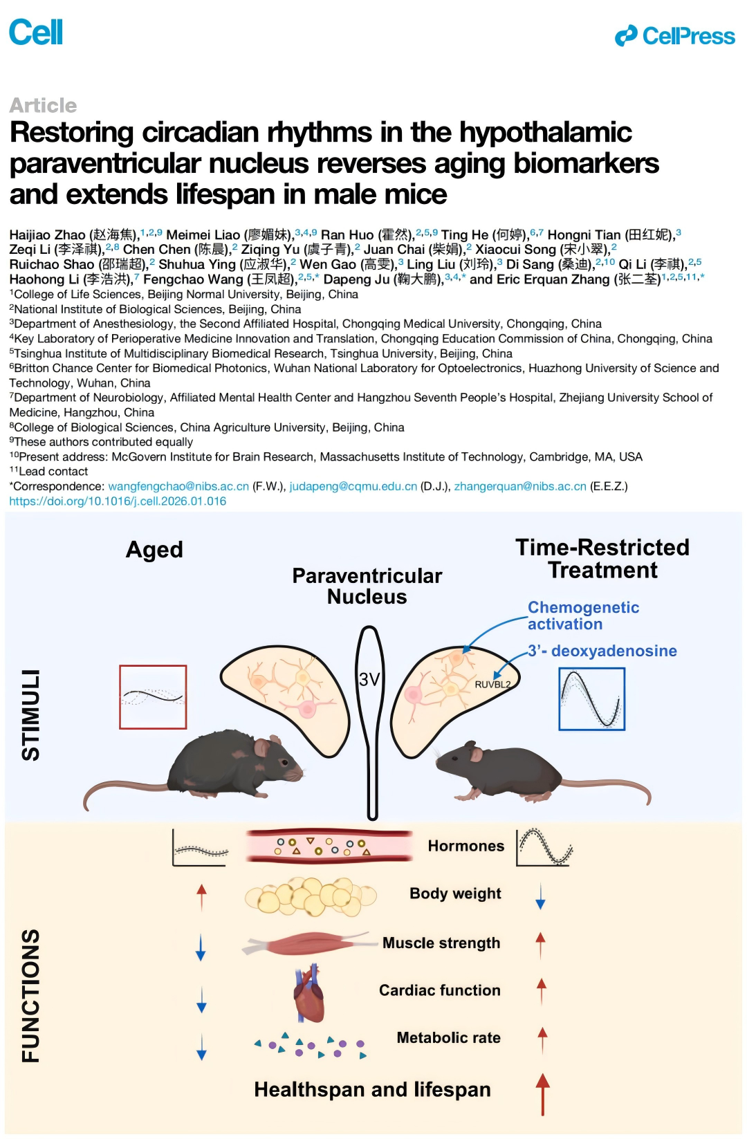 2026年3月北京师范大学/北京生命科学研究所、重庆医科大学附属第二医院、北京生命科学研究所,在国际顶刊《Cell》上发表了题为“Restoring circadian rhythms in the hypothalamic paraventricular nucleus reverses aging biomarkers and extends lifespan in male mice”的研究论文。