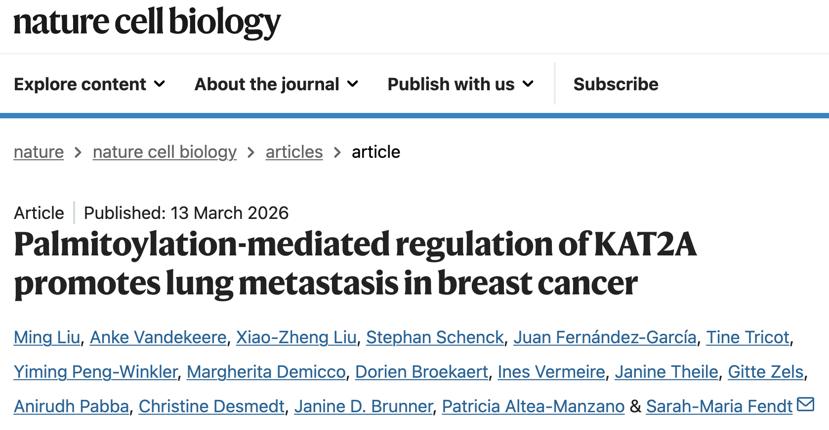 2026年3月,知名期刊Nature Cell Biology上发表了一篇题为 “Palmitoylation - mediated regulation of KAT2A promotes lung metastasis in breast cancer” 的研究论文,为解开上述谜团带来了新的线索。