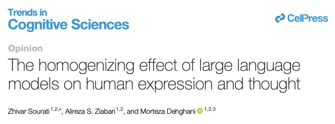 近日,南加州大学的研究团队在Cell子刊《Trends in Cognitive Sciences》上发表了一篇颇具影响力的观点文章,题为《The homogenizing effect of large language models on human expression and thought》(大语言模型对人类表达和思维的同质化影响)。