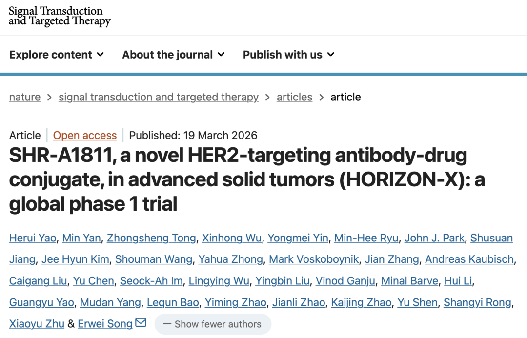 2026年3月19日,中山大学孙逸仙纪念医院团队于《Signal Transduction and Targeted Therapy》期刊发表了一篇题为“SHR-A1811, a novel HER2-targeting antibody-drug conjugate, in advanced solid tumors (HORIZON-X): a global phase 1 trial”的临床研究论文。