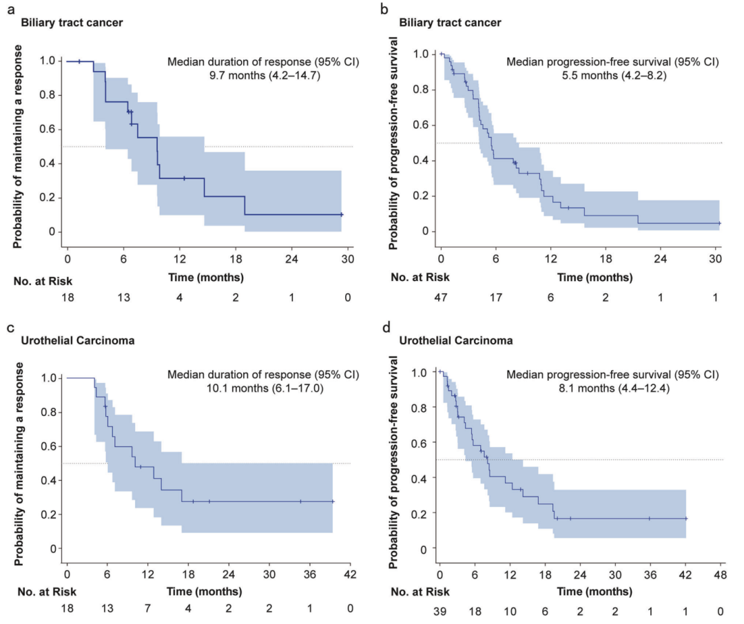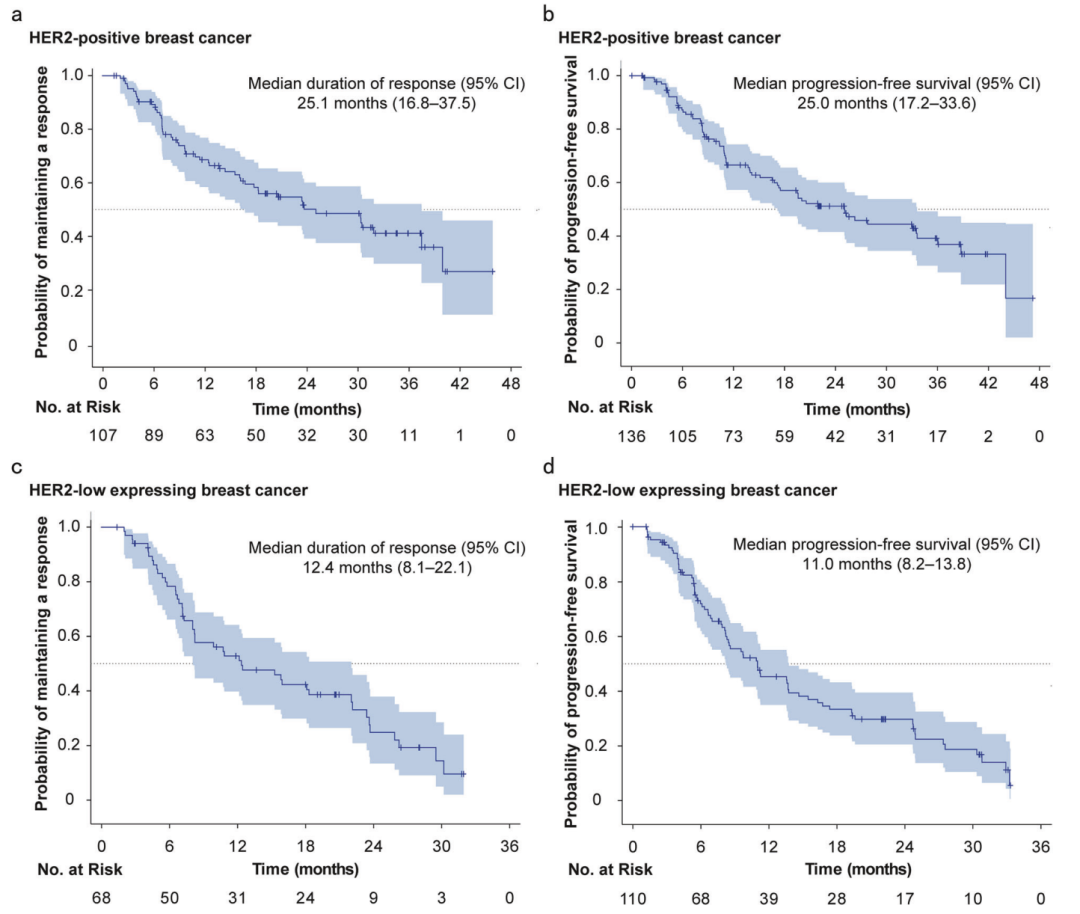 在疗效方面,不同类型患者的中位无进展生存期存在差异:HER2阳性乳腺癌患者的中位无进展生存期达到了25.0个月;HER2低表达乳腺癌患者的中位无进展生存期为11.0个月;非乳腺肿瘤患者的中位无进展生存期在3.5至17.2个月不等。