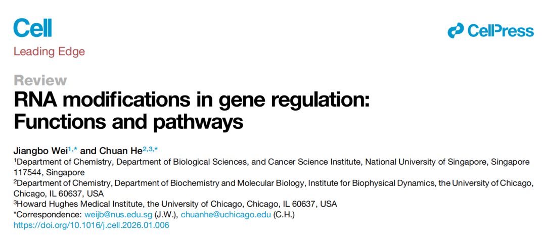 2026年3月,芝加哥大学与新加坡国立大学携手,在《Cell》期刊发表了一篇题为“RNA modifications in gene regulation: Functions and pathways”的综述论文。