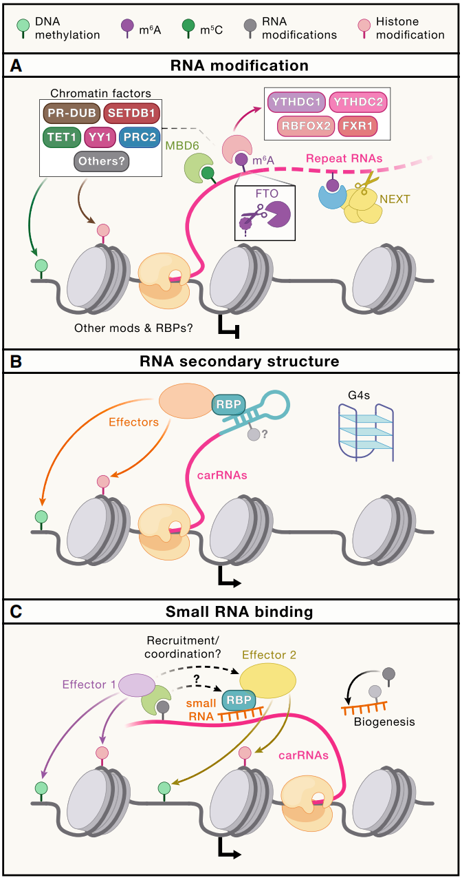 自2020年起,该领域的研究又迈向了一个全新的前沿领域——染色质和转录调控中RNA修饰的探索。染色质相关调控RNA(carRNA)是一类特殊的RNA,其中包括增强子RNA(eRNA)、启动子相关RNA(paRNA)以及从重复(或逆转录转座子)元件转录而来的RNA(repeat RNA)。这些carRNA都携带有m6A、m5C以及可能存在的其他化学标记。与组蛋白标记介导的调控模式类似,carRNA上的这些修饰能够被专门的“阅读器”识别,进而招募各种染色质因子,例如组蛋白修饰酶、染色质重塑因子、DNA甲基化机制和核RNA降解复合物等,共同调节局部染色质状态和转录活动。这种调控方式通常是顺式作用,即对邻近的基因发挥作用。与组蛋白尾部修饰有所不同的是,组蛋白尾部修饰可能缺乏内在的序列背景,需要依赖其他蛋白质因子来实现调控特异性;而carRNA上的修饰则能够巧妙地利用宿主RNA序列来实现精准的调控特异性。例如,在漫长的进化过程中,数百到数千个基因位点内或附近都编码了不同的反转录转座子元件。这些重复RNA的修饰就像是一个复杂的调控网络枢纽,能够整合多个转录因子网络,从而同时协调大量基因集的转录调控,展现出其强大的调控能力。