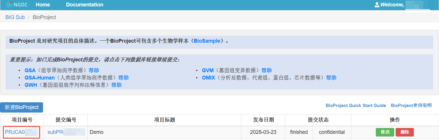 (3) 提交后系统会分配一个 BioProject 编号,请记录下来,下一步要用。