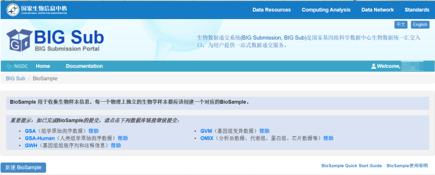 (1) 在系统首页(https://ngdc.cncb.ac.cn/gsub/)点击BioSample -> 新建 BioSample